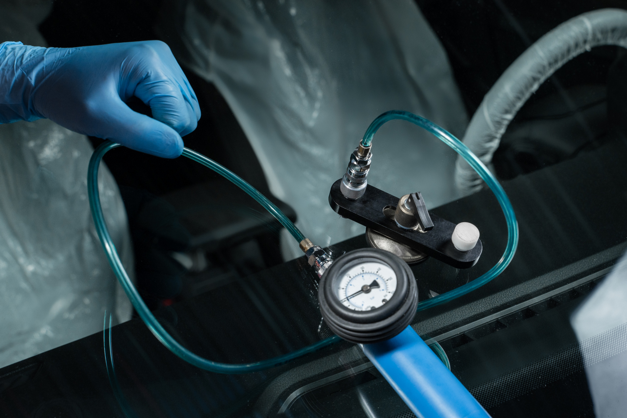 Помещаем специальный инструмент – зеркало на внутреннюю сторону стекла для контроля процесса ремонта